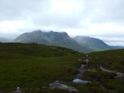 As I rounded the shoulder of Sail Liath, the sight of Beinn Dearg Mor ahead dominated the view, still impressive despite the cloud clinging onto the top of this mighty Corbett. My eyes were firmly on my feet, though; quick thinking being required to stay upright and not slip on the wet ground.