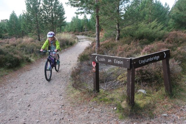 A surfaced cycle path crosses the road – where courteous drivers stopped to allow us to cross – and heads up to Inverdruie. Clara was already asking how long the ride was and complaining of tired legs, but I knew she could handle a ride like this, even after her run.