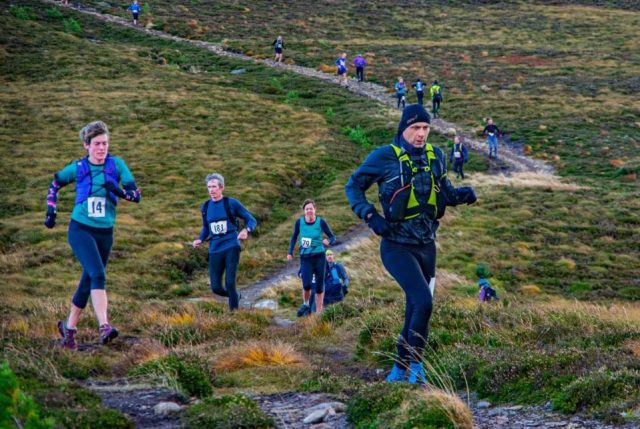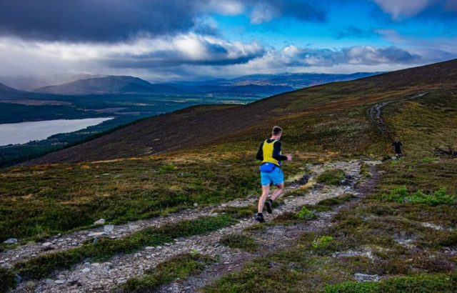 The route begins on forest tracks, climbing very gradually to meet the path up to Meall a’ Bhuachaille, when the ‘hill’ element of the race really begins. The path climbs up into Coire Chondlaich, getting above the trees and onto the open hillside. It’s a stiff pull up to the bealach but there’s still another 200 metres or so of climbing to reach the cairn.